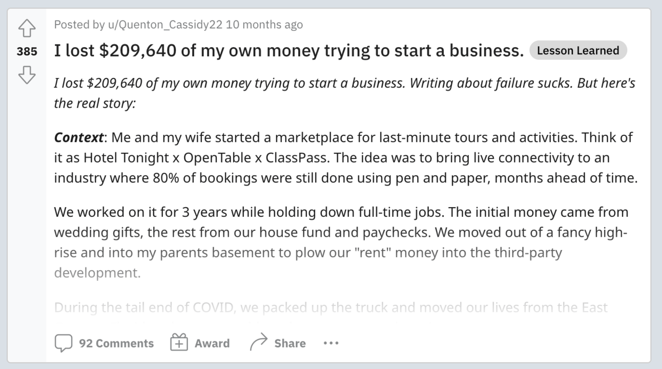 Related to the above, use private data to tell a better story briefly. I studied the Top posts in the entrepreneur-related subreddits and most of them are case studies where the founders reveal their internal numbers. This is another advantage of anonymity. They’re often packed with data and emotion (i.e., anger).