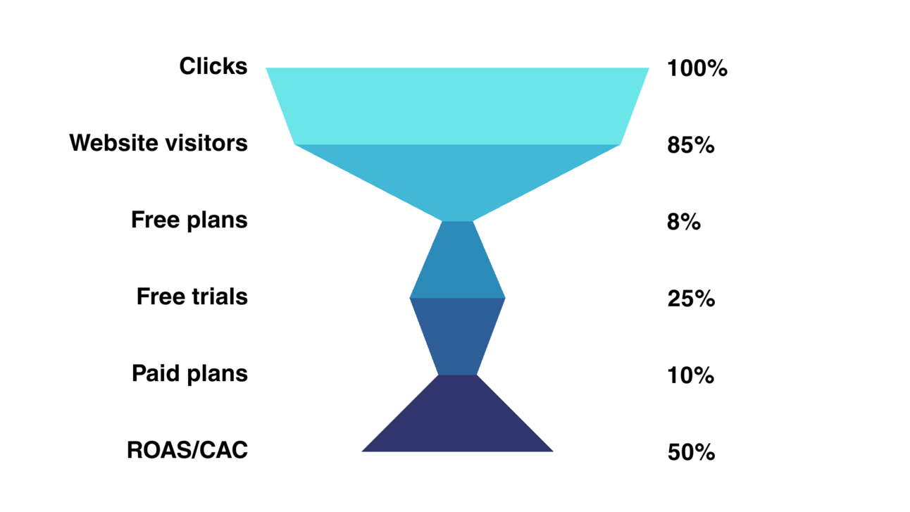 Your funnel is the “journey” a user takes from the moment they see your ad to the moment they pay you. Reminder that this funnel is for a B2C site that offers both a free plan and a free trial (yours might not offer either, which we’ll address below).